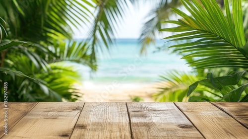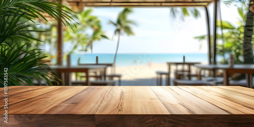 A serene beachfront bar with a wooden counter, surrounded by palm trees and a beautiful sunset over the ocean.