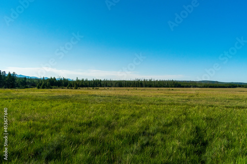 Serene sunset over lush green field with distant forest and clear sky
