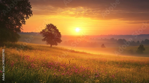 Colorful spring sunrise on meadow