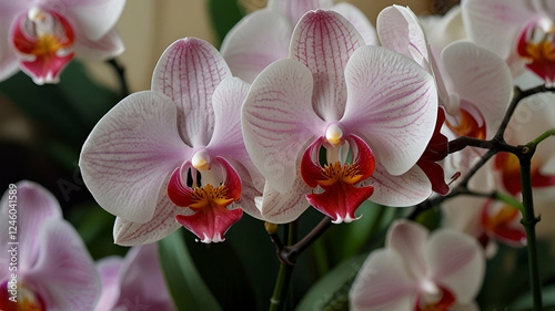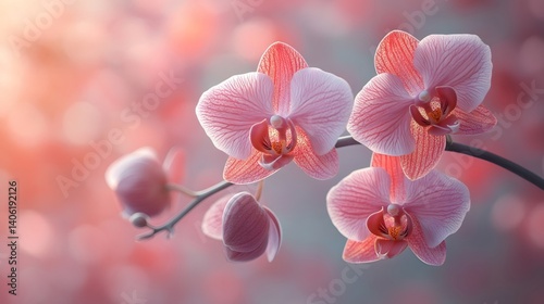 Beautiful pink orchids arranged gracefully against a whimsical patterned background with soft light
