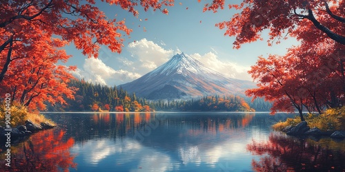 Autumn view of Mount Fuji reflected on calm lake