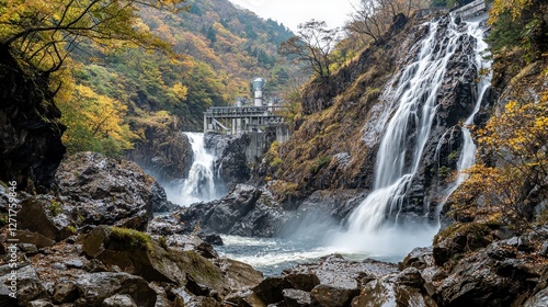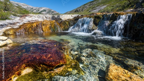 A Small Waterfall Cascading into a Dark, Enclosed Pool Within a Rocky Gorge, Featuring Jagged Cliffs, Sparse Vegetation, and a Glimpse of Distant Mountains Under a Clear Sky.