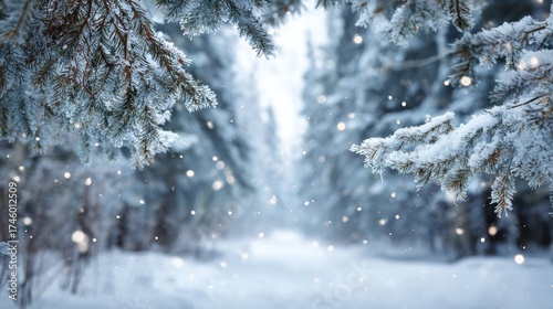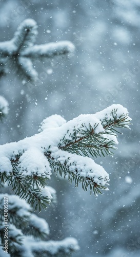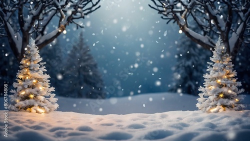 snowflakes falling gently on the tree's branches, calm, dark blue, peaceful