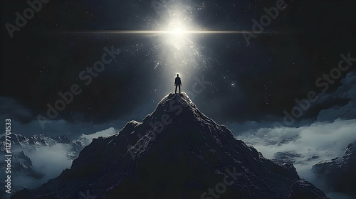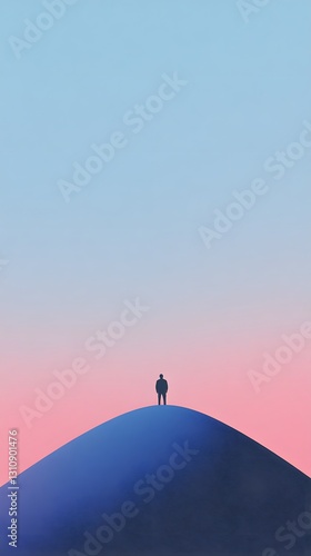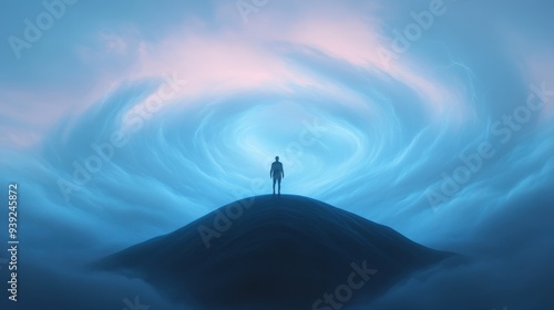 A solitary figure stands atop a verdant hill under a brooding, cloud-filled sky, creating a striking silhouette against nature's tumultuous canvas. Verdant Incubation. Illustration