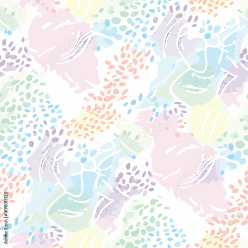 Vector seamless pattern with hand drawn colorful Easter bunnies and flowers on a white background. For textile, wallpaper and packaging