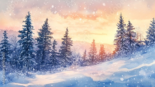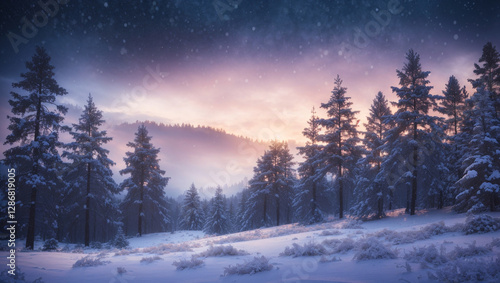 A breathtaking winter landscape featuring a vast, untouched snow-covered field. Snowflakes gently fall from the sky, creating a peaceful and magical atmosphere.