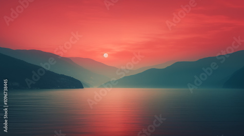 A peaceful sunrise over a tranquil lake with mountains in the background, soft pastel colors in the sky