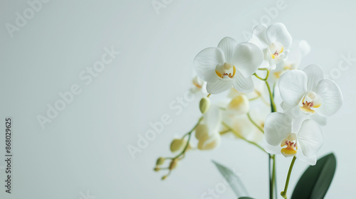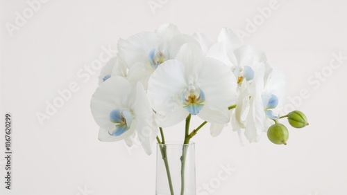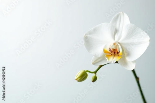 A close up shot of a white orchid with green buds against a plain white background in soft lighting