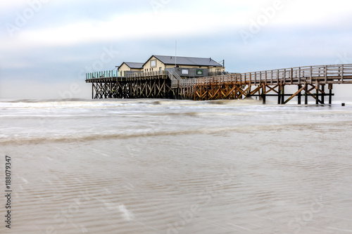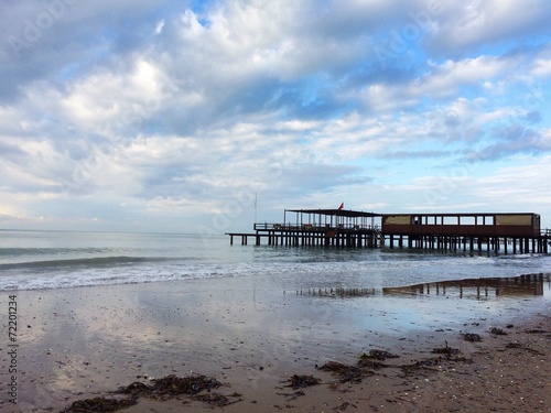 Wooden bathhouse on stilts over the sea in Torekov, Sweden.