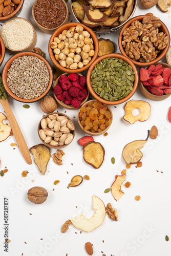 Different aromatic spices on white background, flat lay