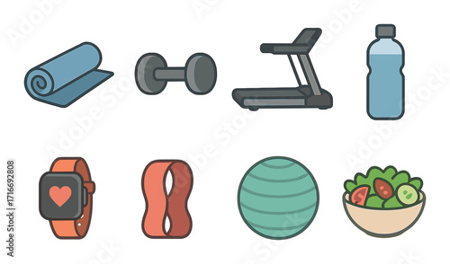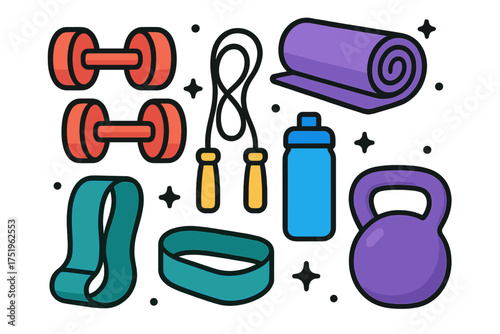 Gym Equipment Icon Set Apple, Dumbbell, Kettlebell, Bottle on Transparent