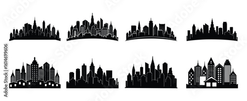 a set of silhouettes of city skylines with clouds and sun, city skyline, urban skyline
