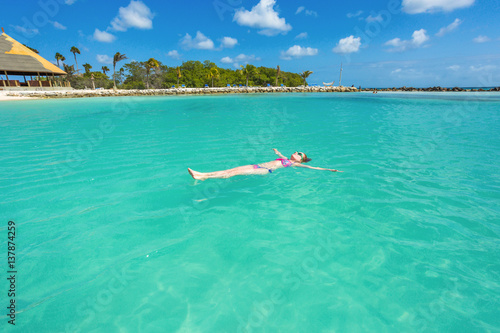 Outrigger boat in turquoise water near a tropical island with palm trees and a sandy beach