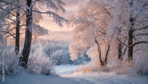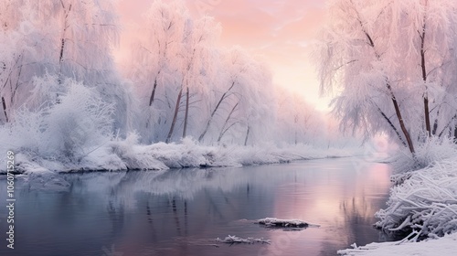 Сhristmas Lace.Winter landscape in pink tones with hoarfrost everywhere.Mostly calm winter river, surrounded by trees covered with hoarfrost and snow that falls on a beautiful pink morning light.