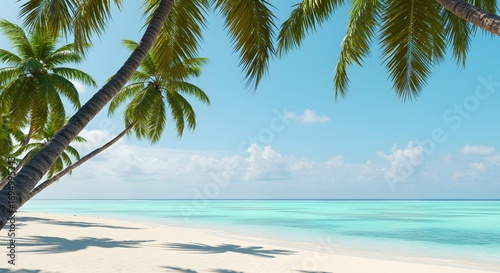 Tropical beach with palm trees, ocean, island, sky, water, paradise, travel, landscape, nature, summer, vacation, 8K image
