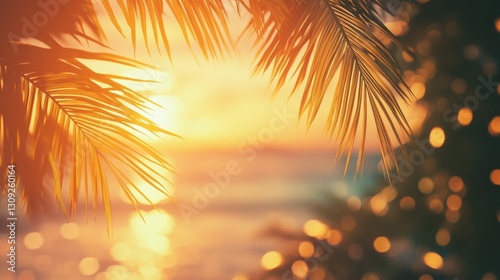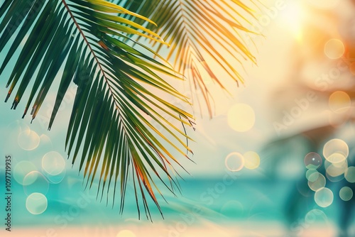 Tropical palm tree with colorful bokeh sun light on sunset sky cloud abstract background
