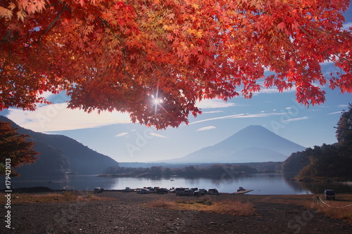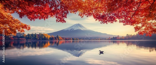 Peaceful Autumn Scene of Mount Fuji Japan with Red Leaves Reflecting in Kawaguchiko Lake