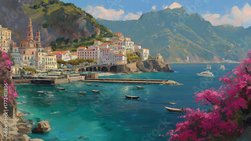 Picturesque amalfi coast town with colorful buildings and boats in the bay