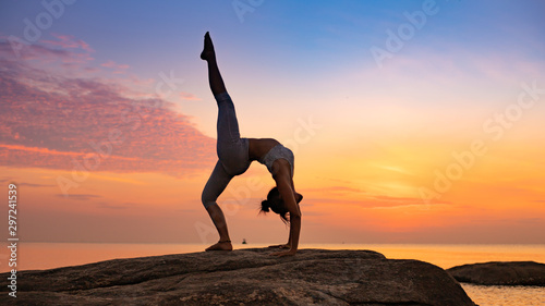 Silhouette yoga practice at sunset. Yong woman doing yoga exercise on the beach