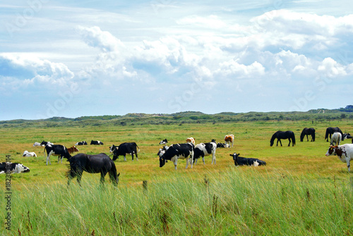 Red and black Holstein cows are grazing on a cold autumn morning on a meadow in Switzerland