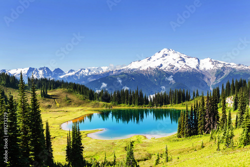 Sun setting over Mt Rainier at Tipsoo lake in Mt Rainier national park in Washington