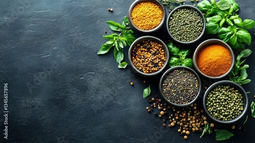 Spices and herbs on a wooden board. Pepper, salt, paprika, basil, turmeric. On a black wooden chalkboard. Top view. Free copy space.
