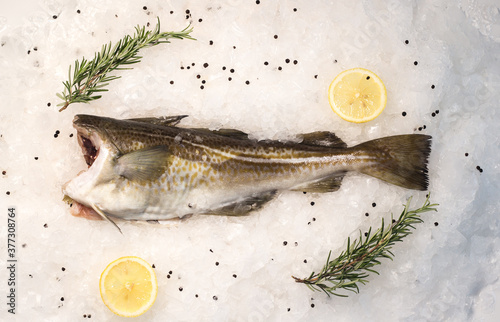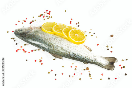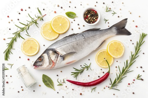 Tasty fresh seabass fish with spices on white background