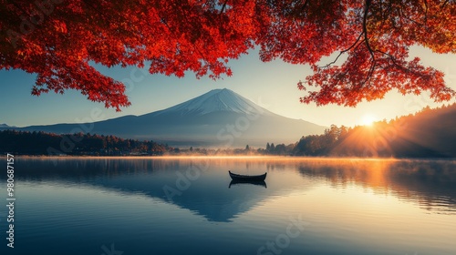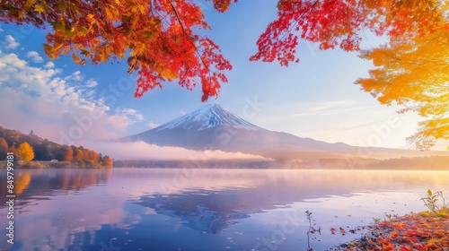 Colorful Autumn Season and Mountain Fuji with morning fog and red leaves at lake Kawaguchiko is one of the best places in Japan