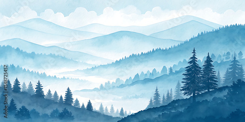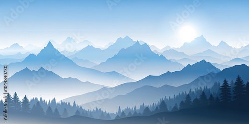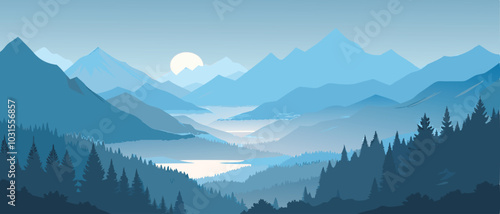 Realistic mountains landscape. Morning wood panorama, pine trees and mountains silhouettes. Vector forest hiking background