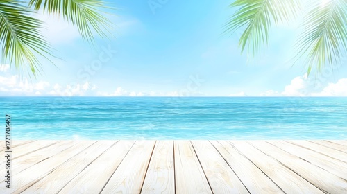 Wooden floor or plank on sand beach in summer. For product display.Calm Sea and Blue Sky Background.