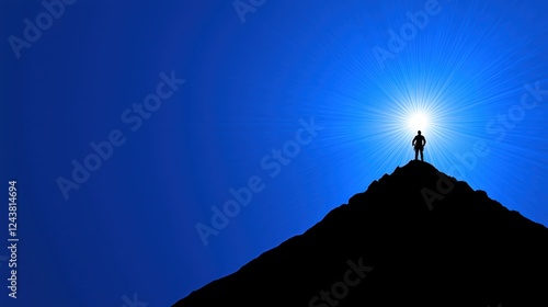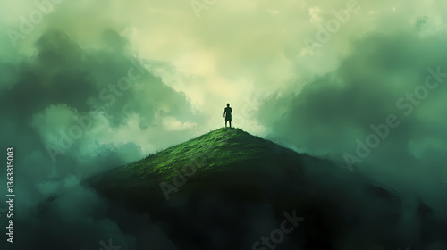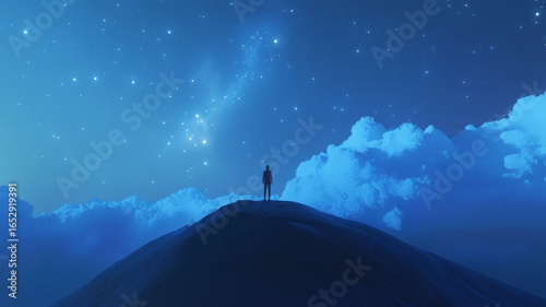 Aurora borealis and silhouette of a man on the mountain peak. Lofoten islands, Norway. Beautiful aurora and man. Alone traveler. Sky with stars and polar lights. Night landscape with northern lights