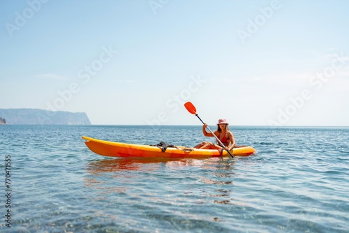 Aerial view of woman on stand up paddle board in blue ocean.