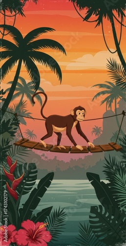 Cheetah Walking in Safari, Palms in Desert Hand Drawn Illustration, Boho Jungle Seamless Border