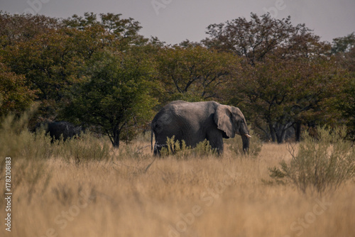 A herd of wild elephants walk through the savanna of Tarangire National Park in Tanzania, East Africa