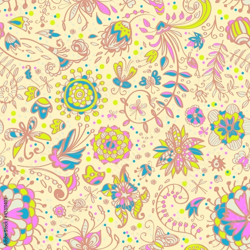 Vintage seamless ornament with birds in foliage and flowers on light beige background. Vector illustration.