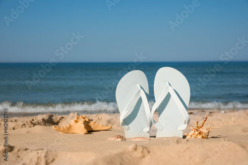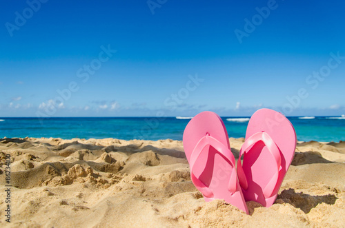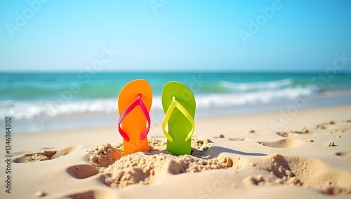 Flip flops stuck in the sand on a sandy beach by the sea or ocean