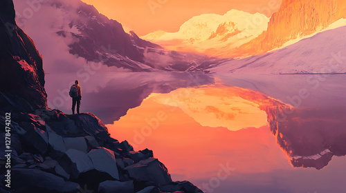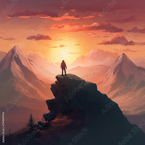Adventurous Man Hiker standing in a cave with rocky mountains in background. Adventure Composite. 3d Rendering Peak. Aerial Image of landscape from British Columbia, Canada. Sunset Sky