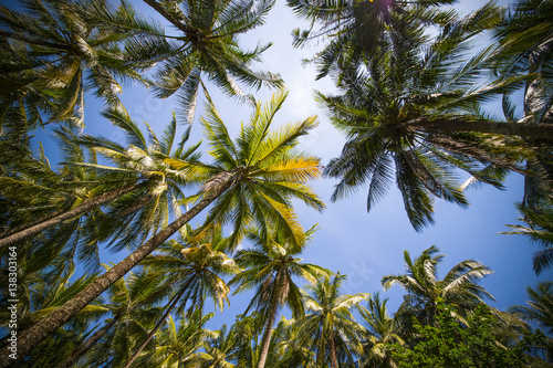 Green palm trees against blue sky and white clouds. Tropical jungle forest with bright blue sky, panoramic nature banner. Idyllic natural landscape, looking up, low point of view. Summer traveling