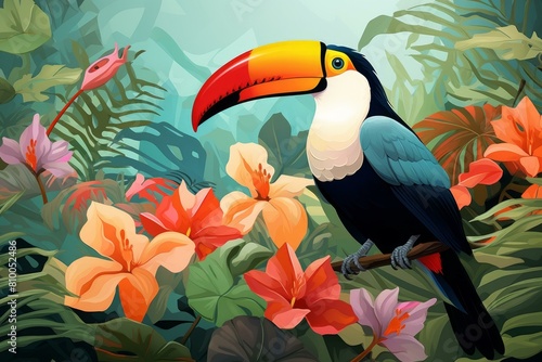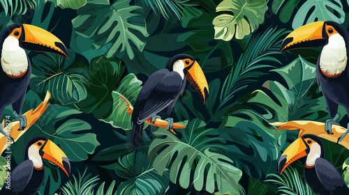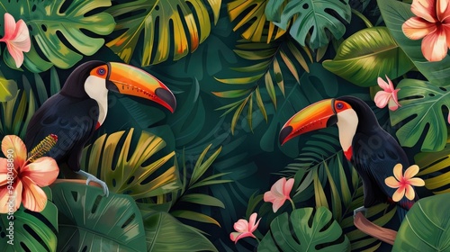 Tropical wallpaper background with plants and birds. Generative AI.
