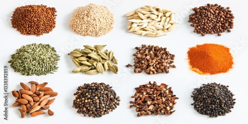 Collage with piles of legumes, rice, cereals and linseeds on white background