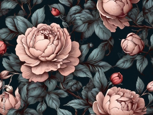 Seamless stylized muted colors palette peony pattern. Generative AI