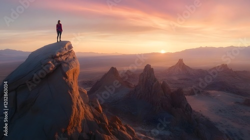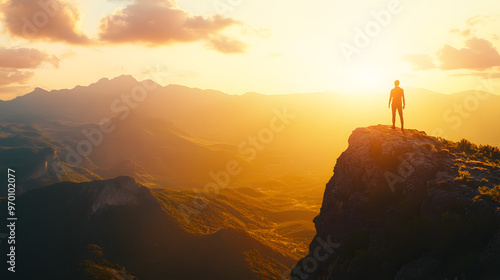 Person on top of a majestic mountain landscape with sunset in the background. Image of overcoming and conquest. Young man standing on the edge at the top of mountain. 3D realistic illustration. Creati