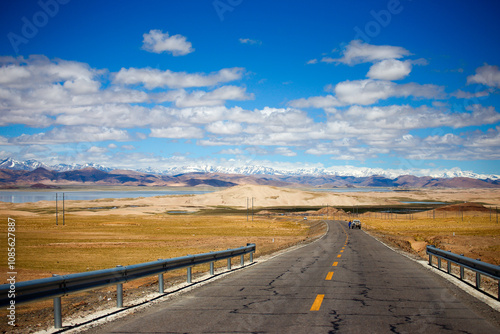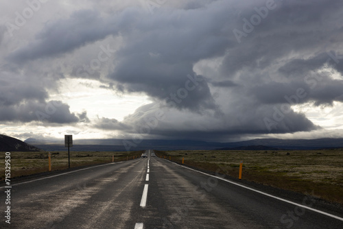 Driving car on black asphalt road through white sandy dunes near Corallejo beach on sunset Fuerteventura, Canary islands, Spain