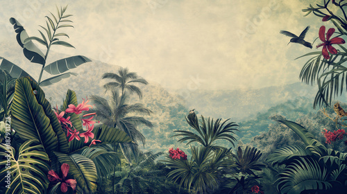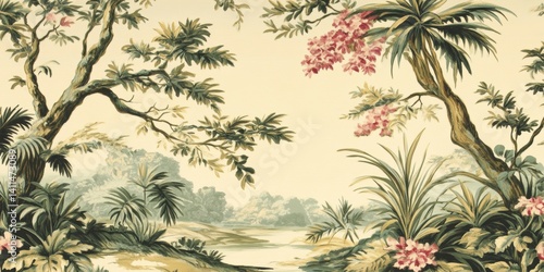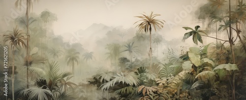 Watercolor pattern wallpaper. Painting of a jungle landscape.