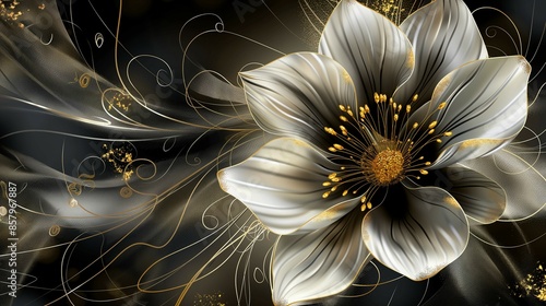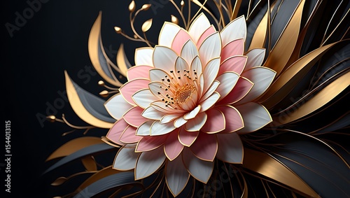 Golden metal volumetric flower on an abstract 3D background.
