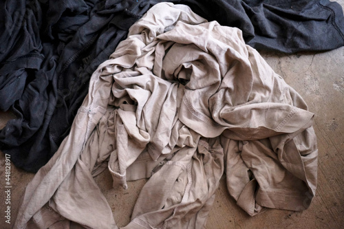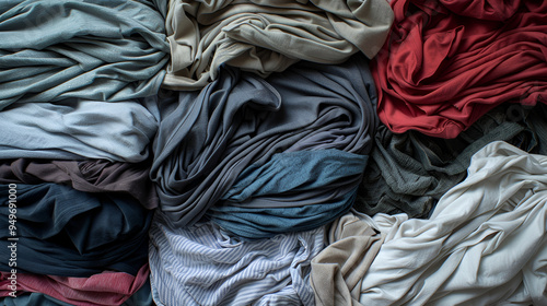 A variety of different colored clothes piled on top of each other, creating a stack of laundry. The clothes appear to be a mix of shirts, pants, and other garments.