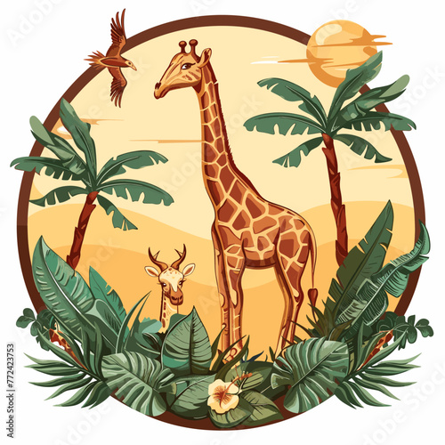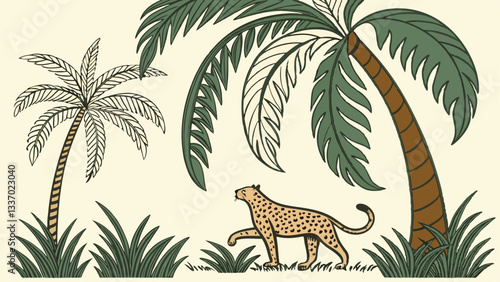 A vintage-style wallpaper with lush green palm leaves, towering trees, and wild animals like giraffes or lions in the jungle on a white background, painted in a watercolor style with very soft colors