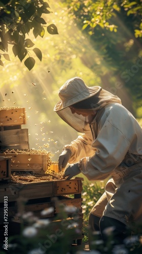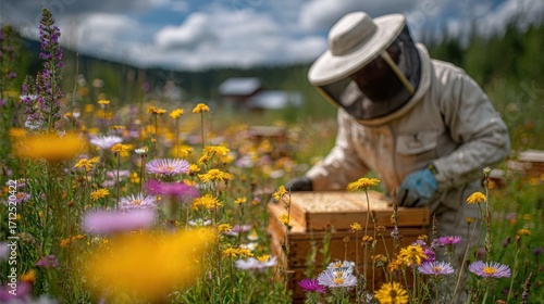 A person is picking up a beehive in a field filled with colorful flowers. The individual seems to be tending to the hive in the midst of the blooming meadow