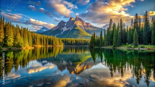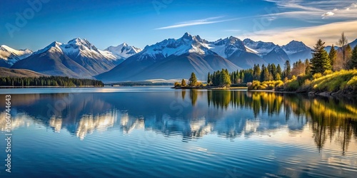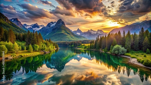 Sunrise over the picturesque mountains, reflecting in a crystal-clear lake surrounded by lush green trees, Mountains, sunrise