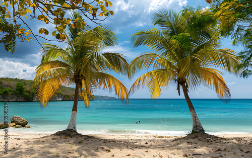 Palm-fringed tropical beach with white sand and turquoise water under a bright blue sky.